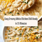 This White Easy Creamy Chicken Chili is a delicious twist on classic chili, featuring tender white chicken meat, creamy broth, and white beans instead of traditional red ingredients. It’s quick to prepare, taking only about 25 minutes total, and offers a lighter, creamier flavor profile that’s perfect for meal prep or a cozy meal. The recipe includes savory aromatics, mild green chilis, sweet corn, and a blend of spices, finished with sour cream for a rich, smooth texture. Add optional cornmeal for authentic Tex-Mex thickness and feel free to toss in extra veggies for added nutrition.