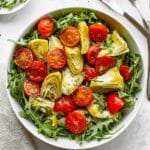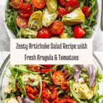 A vibrant and refreshing Zesty Artichoke Salad featuring juicy grape tomatoes, peppery arugula, marinated artichoke hearts, and roasted red peppers tossed in a tangy homemade dressing made with olive oil, white wine vinegar, and herbs. Perfect as a light lunch or a colorful side dish that dazzles your taste buds with bold Mediterranean flavors.