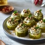 Zesty Deviled Pickles are a vibrant and flavorful snack perfect for any gathering. Creamy, cheesy, and tangy with a hint of heat from hot sauce and Korean chili flakes, these stuffed pickle chips bring a delightful crunch and savory richness that will impress your guests and steal the snack show!
